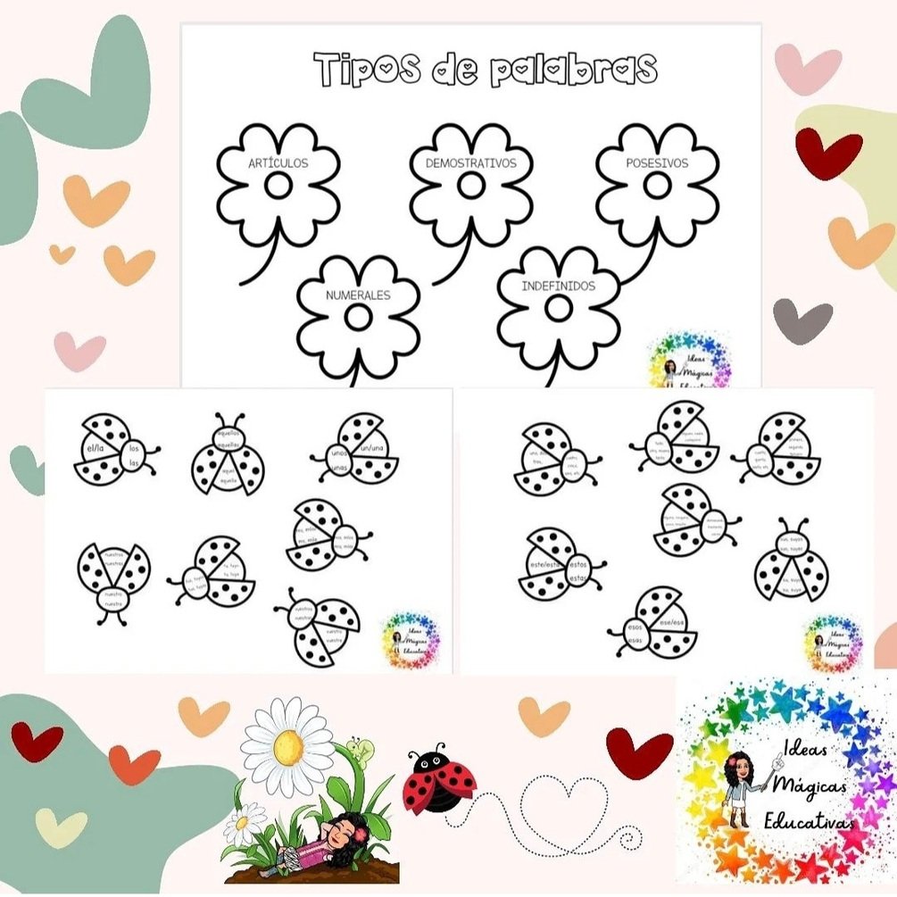 Cada flor es un tipo de palabra: artículos, posesivos, numerales, indefinidos y demostrativos. Cada mariquita lleva escrita una serie de palabras que debe ser clasificada con su flor correspondiente, por ejemplo: Flor: artículos y mariquitas que lleven "el/la, los/las, un/una, unos/unas.