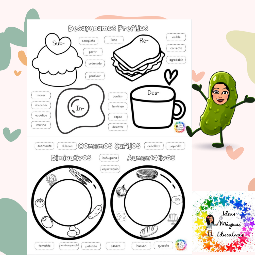 Deben colocar las palabras en su correspondiente objeto o alimento. ACT 1: DESAYUNAMOS PREFIJOS: Cada alimento tiene un prefijo, deben averiguar y colocar cada palabra con su correspondiente prefijo. ACT 2: COMEMOS SUFIJOS: Deben recortar y pegar los diminutivos y aumentativos en su plato correspondiente. Sólo disponible en castellano.